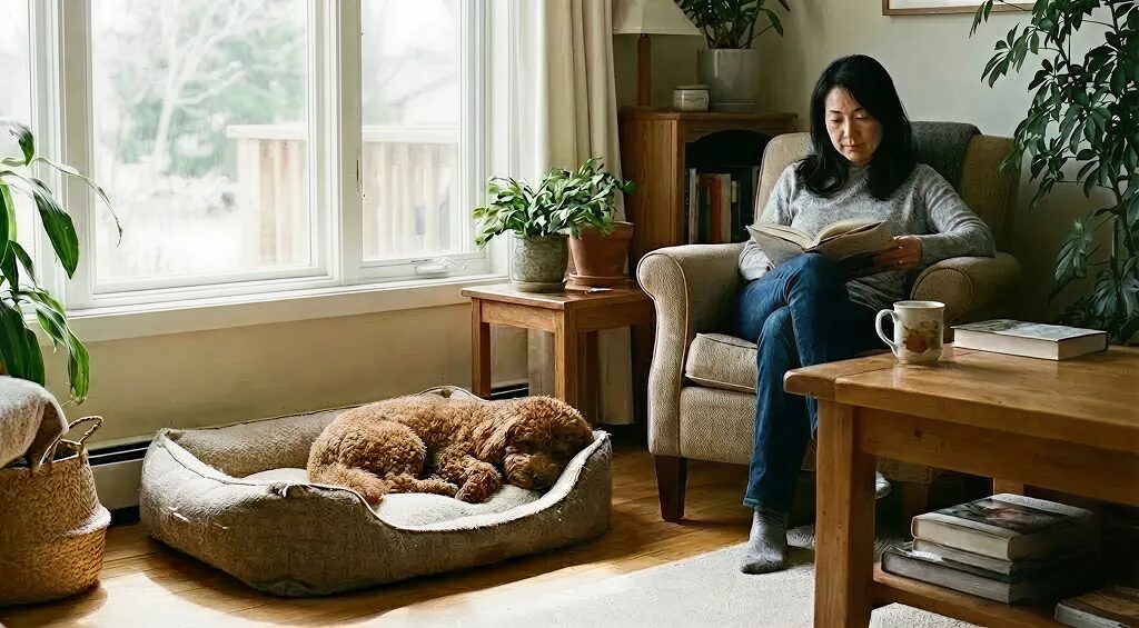 普段、愛犬が落ち着いて過ごしている場所や好んで使用しているブランケットやクッションを用意してあげることで一人でも落ち着いて過ごせる空間を作ります。