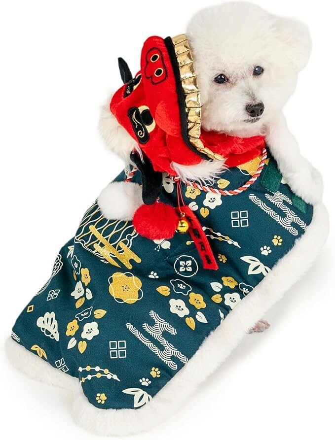 羽織るだけでお正月気分が一気に高まる「獅子舞」。袖を通さないマント型なら、洋服が苦手なワンちゃんでも手軽に変身できます。